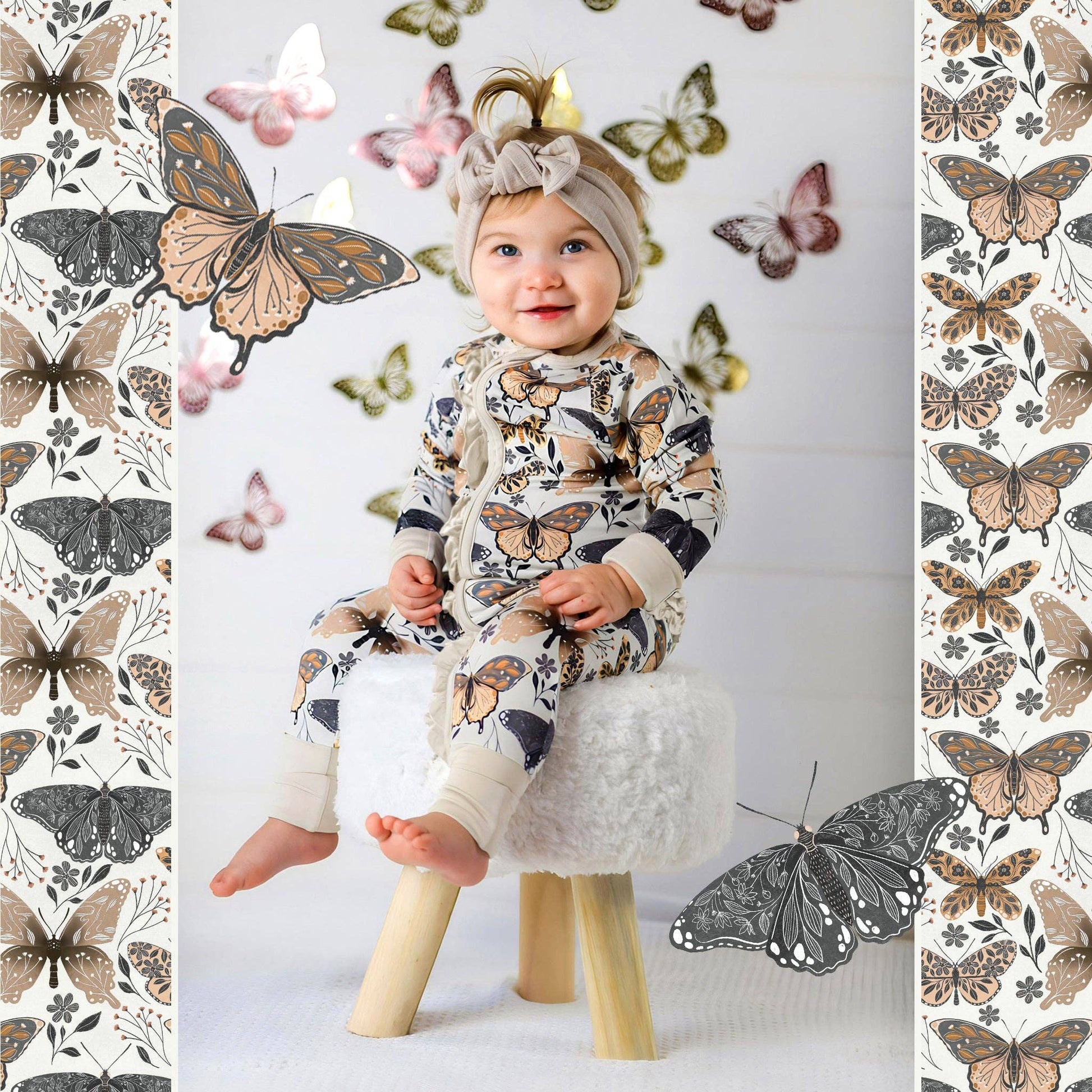 This neutral-colored print features butterflies in varying designs, each one as unique as your little one. From bed to brunch, nature, or playdates with your best butterfly buds, this print will have your outdoorsy babe flying freely.
