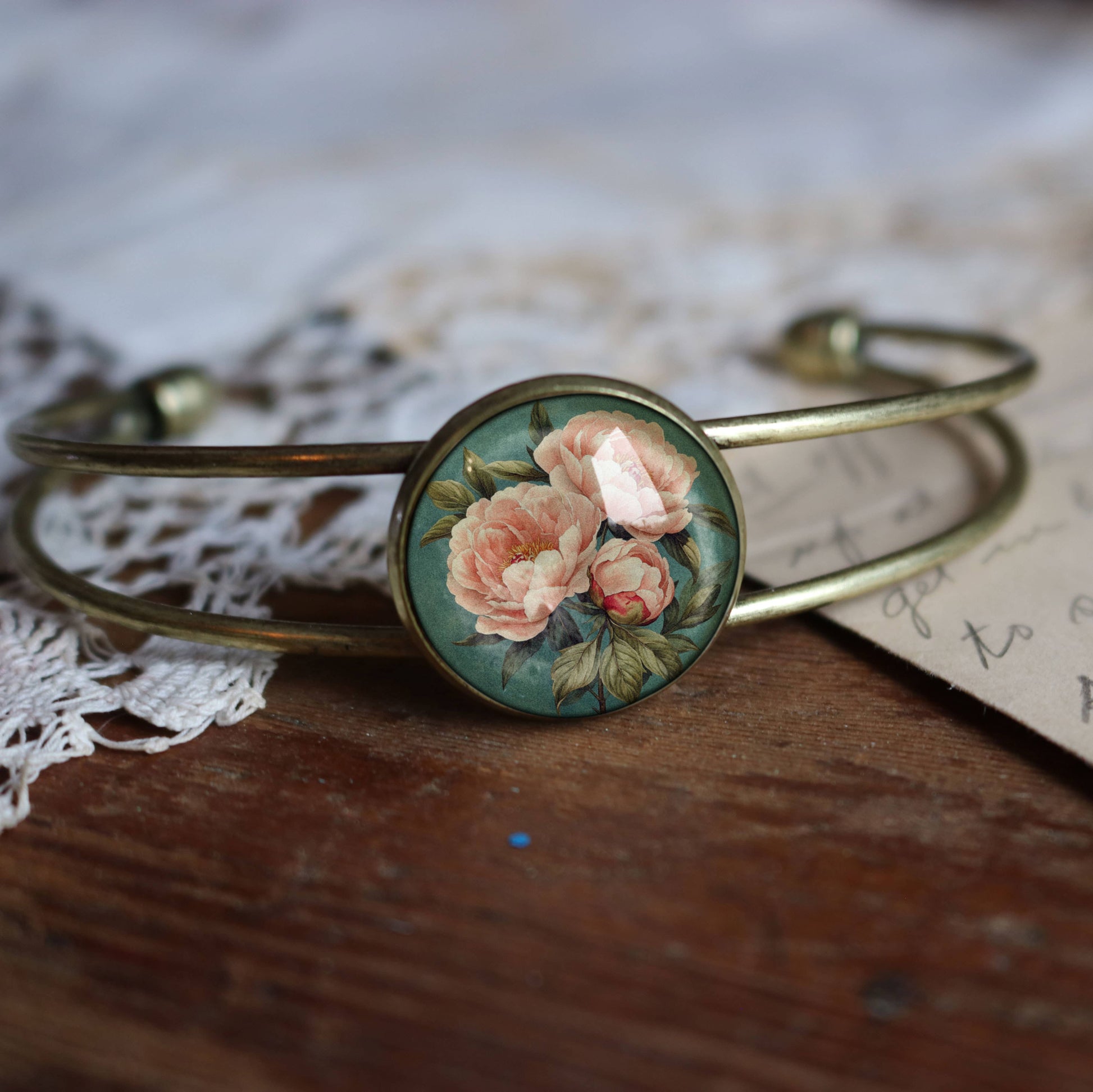 Pink Peony Spring Glass Cabochon Cuff Bracelet