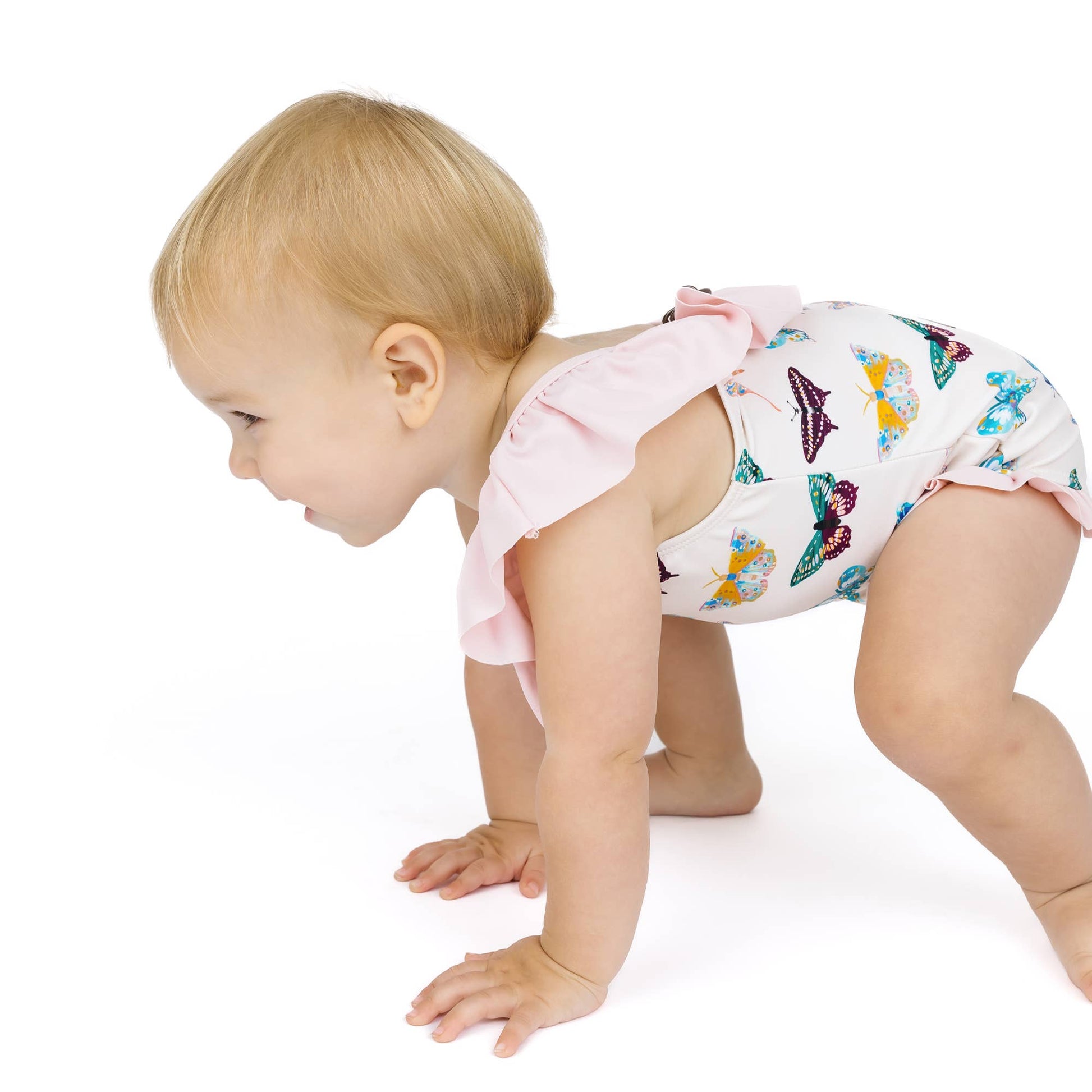 · FEATURES: Our one-piece swimsuit has a sleeveless design with scoop neckline for comfort when moving around + the cutest ruffle detail on the legs! The Inseam snap closure on sizes 0-3M to 18-24M makes diaper changes and trips to the potty easier too!